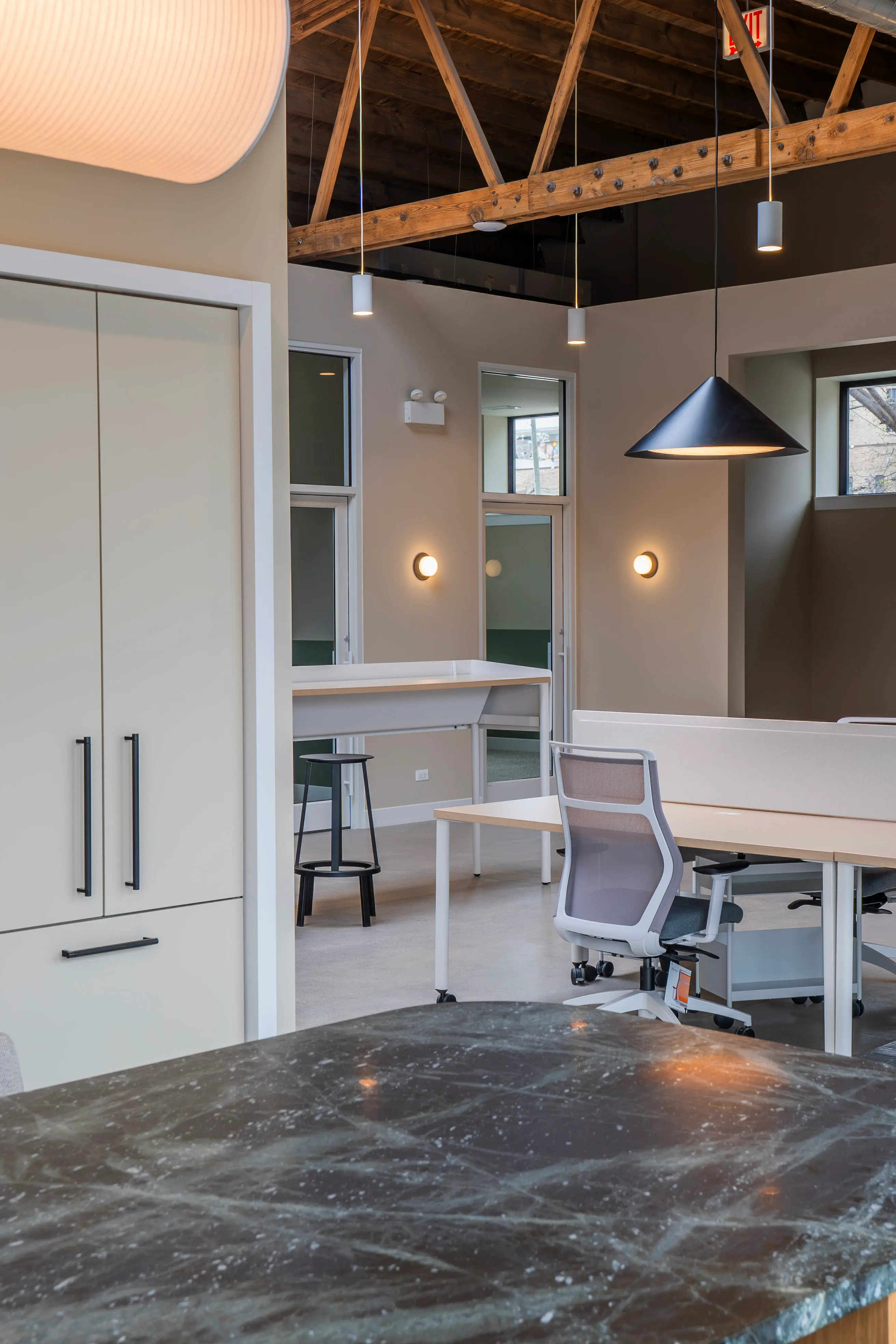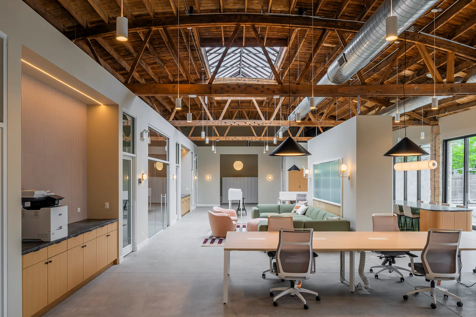 Fellowshop is a shared coworking space built for the design community — a place where creative professionals come to work alongside one another in an environment that reflects the values they bring to their own work. The space inherited something rare: a bowtruss wood ceiling structure of genuine architectural character, exposed brick walls, and the kind of bones that most renovations bury.